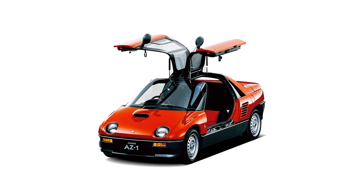 AZ-1はその外見だけで話が終わってしまうほど個性的だ。全高1,150mmという極端に低いクーペボディ、そして縦に跳ね上がるガルウィングドア。全幅1,395mmという軽自動車の制約の中で横開きドアを採用すると乗降時の開口が狭くなりすぎるため、縦開きのガルウィング方式が採用されたとされる。このドアの採用は、現在に至るまで日本の量産車として唯一の例だ。