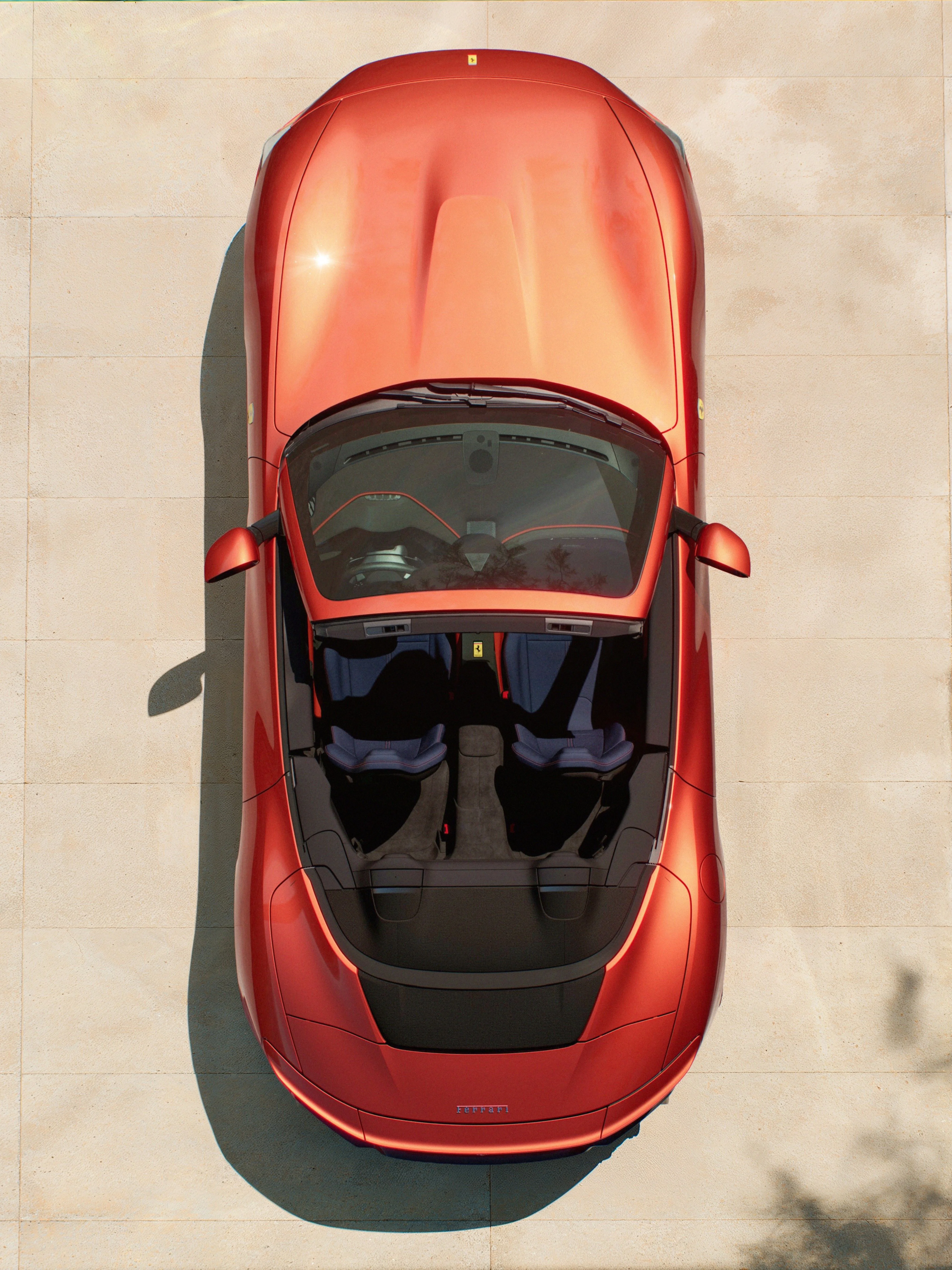 「Rosso Tramonto」はイタリア語で「夕焼けの赤」、クーペに設定された「Verde Costiera」は「海岸の緑」を意味する。どちらもアマルフィ海岸の風景から生まれた色だ。ちなみに、フロントエンジンのフェラーリにソフトトップが復活したのは先代ローマ スパイダーが初めてで、1969年の365 GTS4以来、実に54年ぶりのことだった。