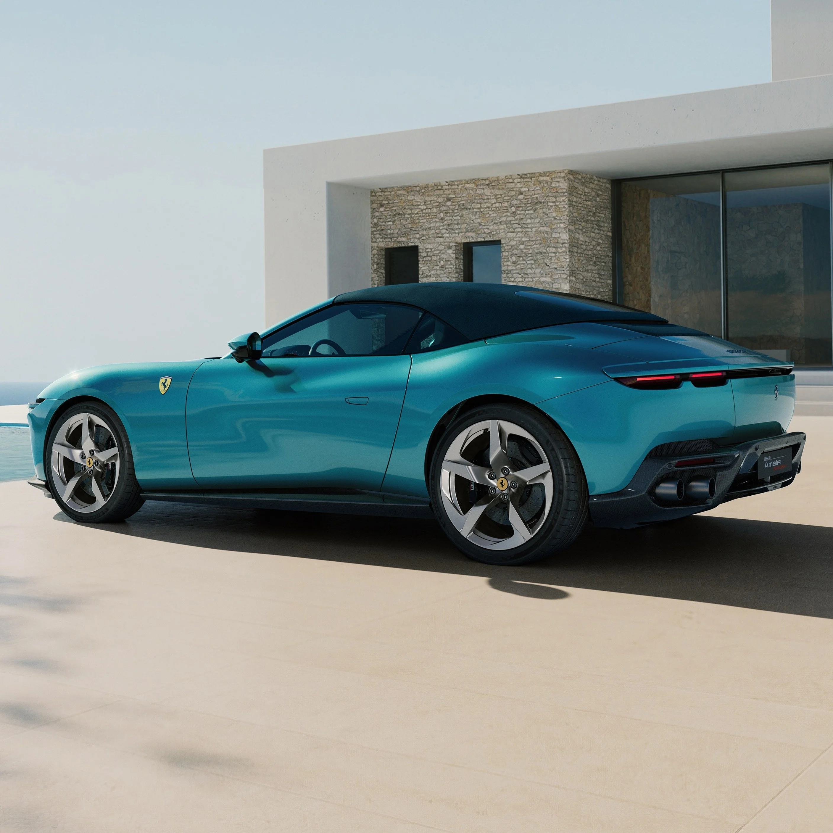 フラヴィオ・マンゾーニ率いるフェラーリ・デザインスタジオが手がけた外観は、クーペのアマルフィが持つプロポーションと造形美を忠実に守っている。ルーフを開けても閉じても、流れるようなシルエットが崩れない。それがこのスパイダーの設計目標だった。