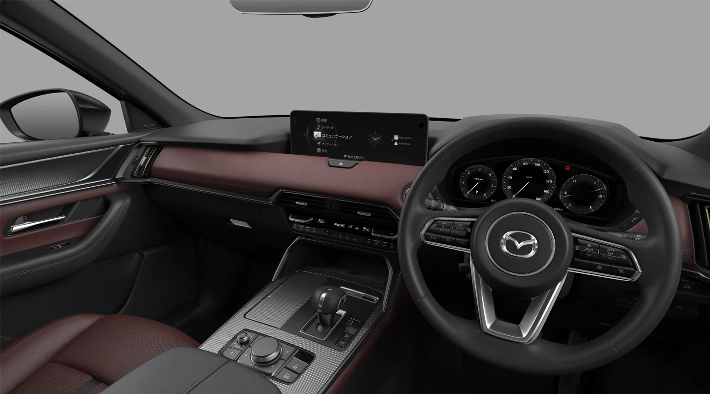 インテリアでは、シフトパネルとコンソールの加飾がメッシュメタルからマットブラックヘアラインに変更された。CX-60のXD機種ではエグゾーストガーニッシュもクロームメッキからブラックメタリック塗装へと変わり、引き締まった印象に仕上がっている。