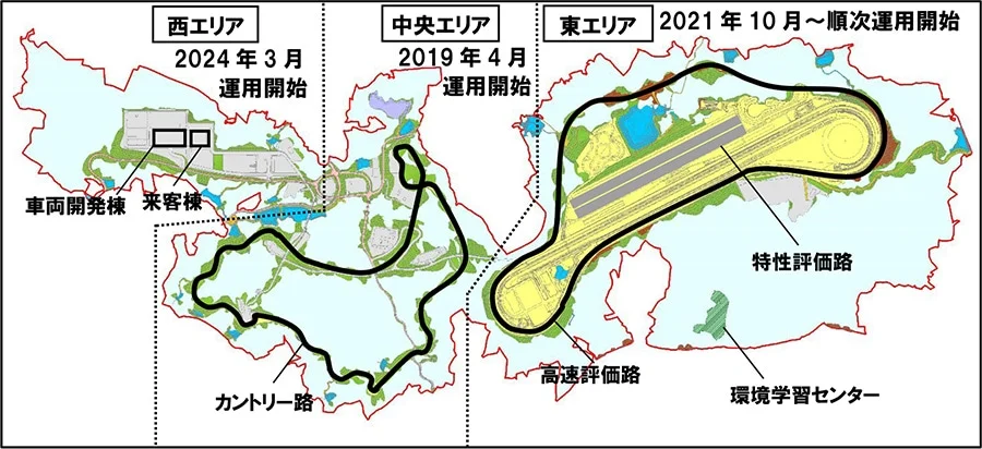 施設は3つのエリアで構成されている。2019年4月に中央エリアが稼働し、2021年10月に東エリアが開業、2024年3月25日に西エリアの車両開発棟と来客棟が完成して全面運用が始まった。約3,000人がここで働いている。